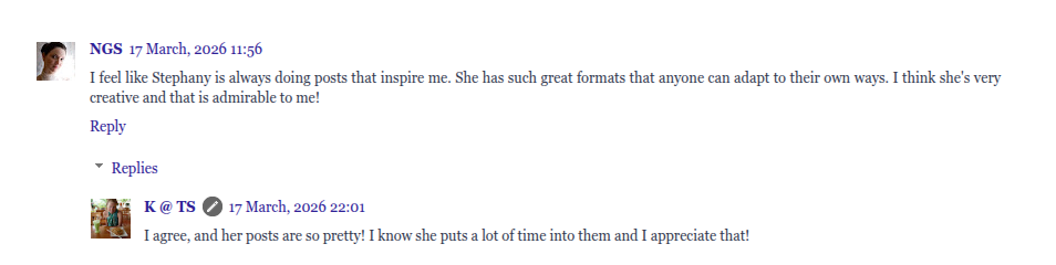 I was scrolling through comments on Kyria’s post on where she finds inspiration, and saw this comment thread between Engie and Kyria! It touched me so deeply, more than they could ever know. I have been in a bit of a funk over the past month, and it’s led to feeling less inspired to blog. I feel like I’m barely hanging on some days, so to see such a sweet comment about my blogging style really lifted my spirits. I care a lot about this blog and the posts I’m publishing, and there is nothing better than knowing other people see the value I’m bringing! Thank you, ladies. I really appreciate the compliments!