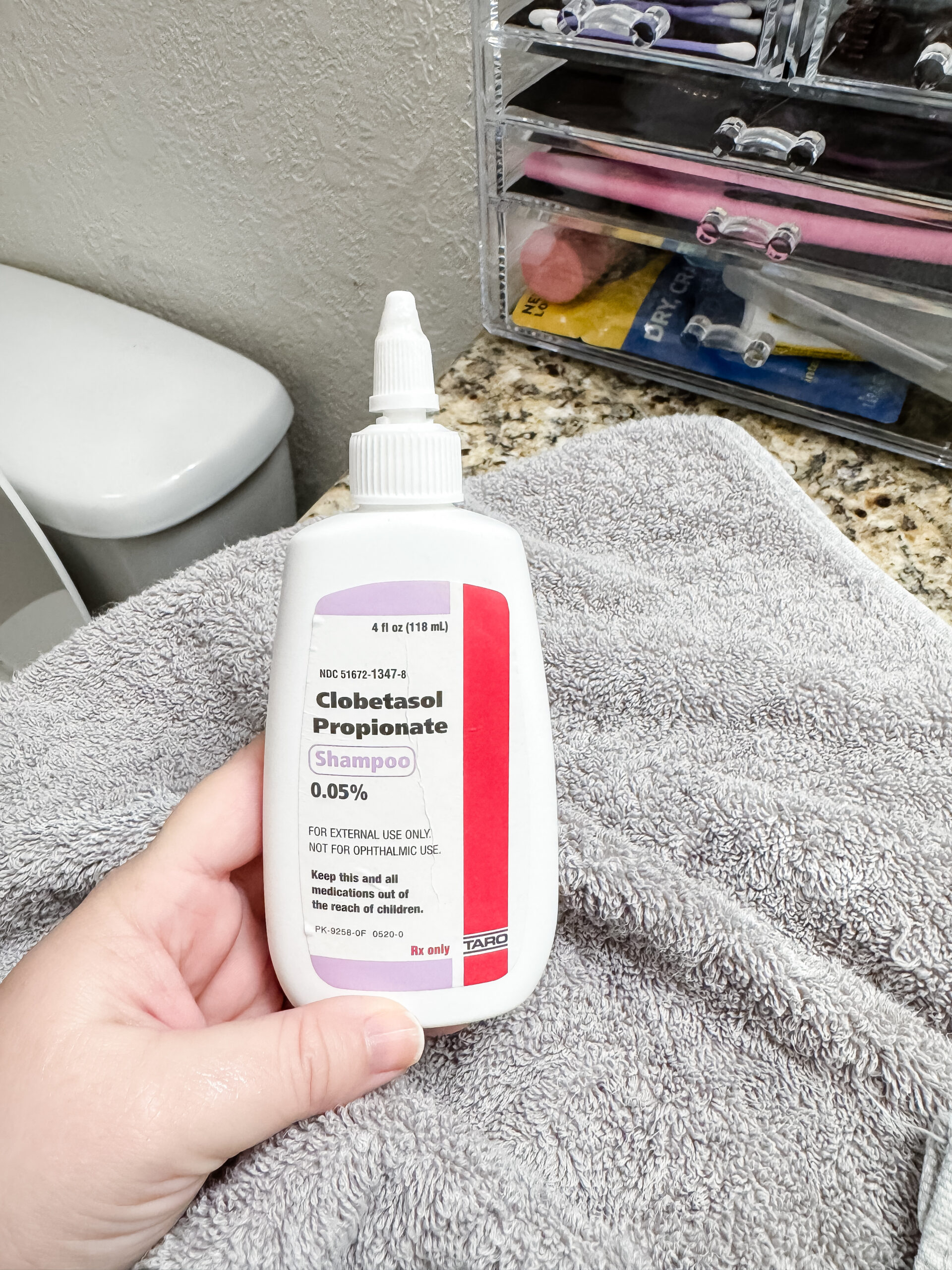 7:33 a.m.: I’ve been up for a bit, but here’s my first photo of the morning. It’s not very exciting, as it’s my scalp psoriasis shampoo. I should be using this twice a week, but it’s really more like twice a month. The reason I’m so bad about using it regularly is because it needs to sit on my scalp for 15 minutes and I’m not about to stand in a shower for 15 minutes while I wait for this shampoo to do its thing. Usually, I put it on before my shower while I sit on the couch and play games on my phone. Then, I rinse it off in the shower and do my regular shampoo routine. Anyway, I have two psoriasis patches right above each ear on my scalp and they’ve been very dry and flaky recently, so this extra step was necessary this morning.