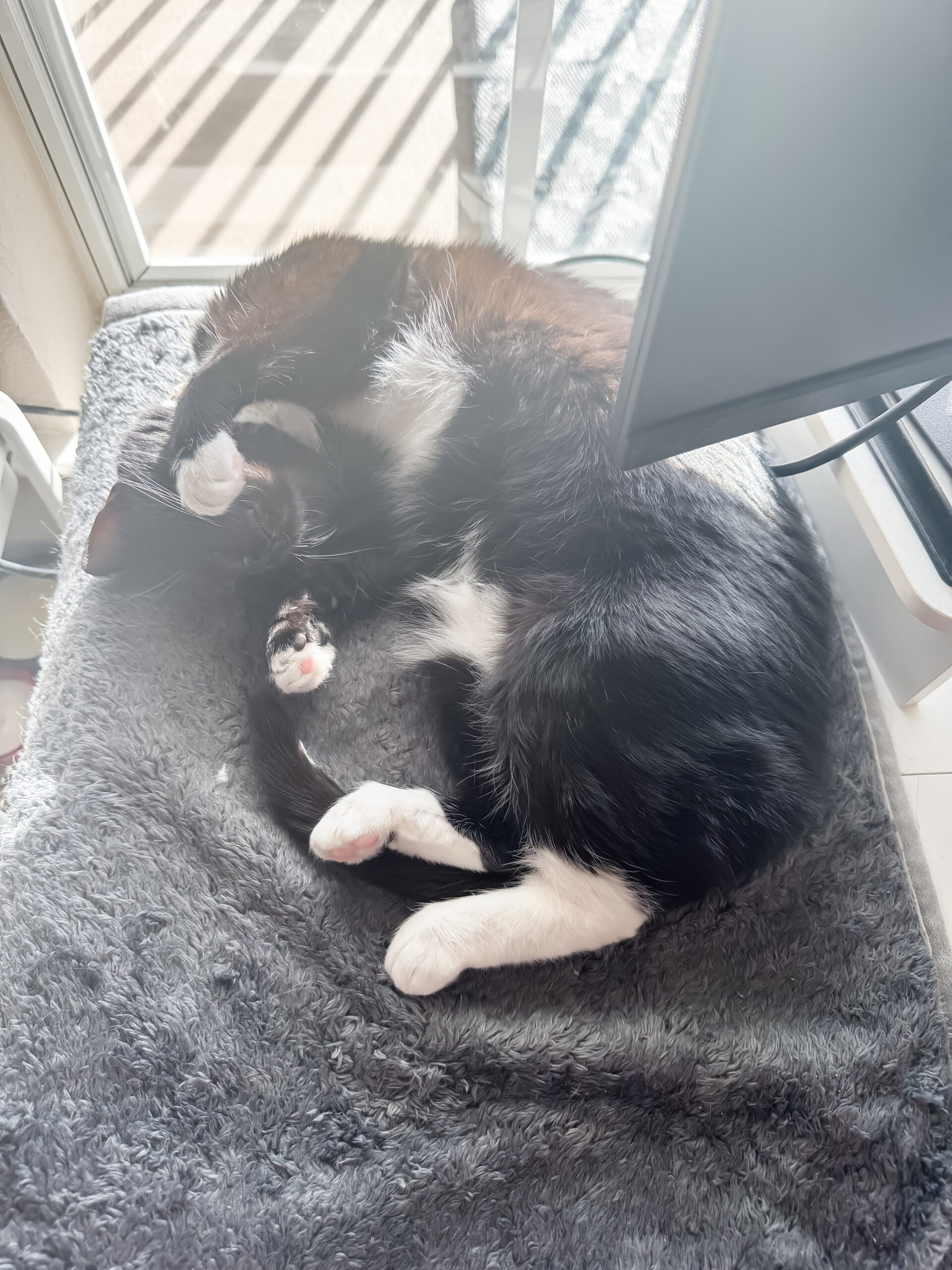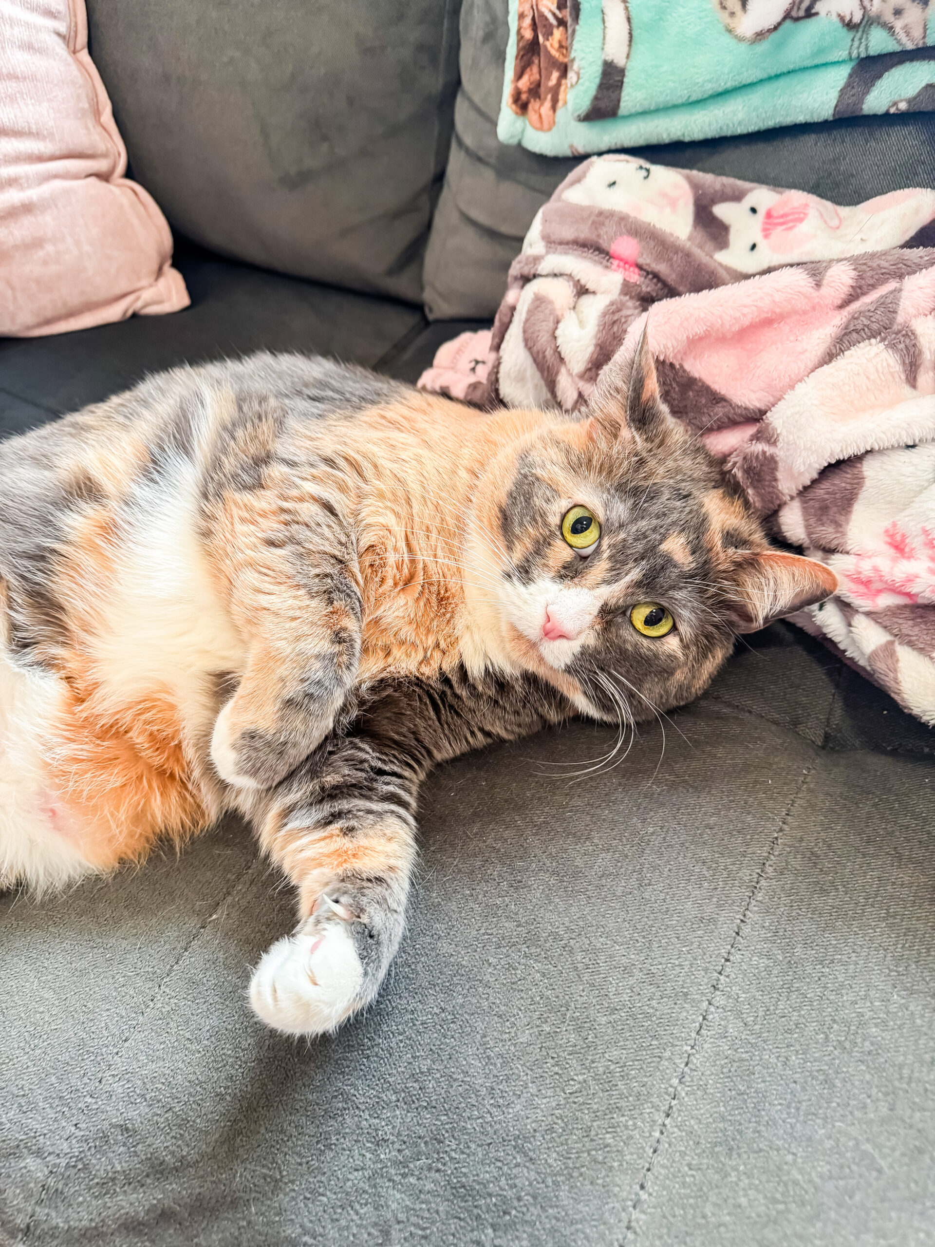 March 11, 2026 – Sweet Lila Bear! I was making breakfast in the morning and saw her lying on the couch with her belly exposed. I very politely asked if I could pet her belly, and she said yes.