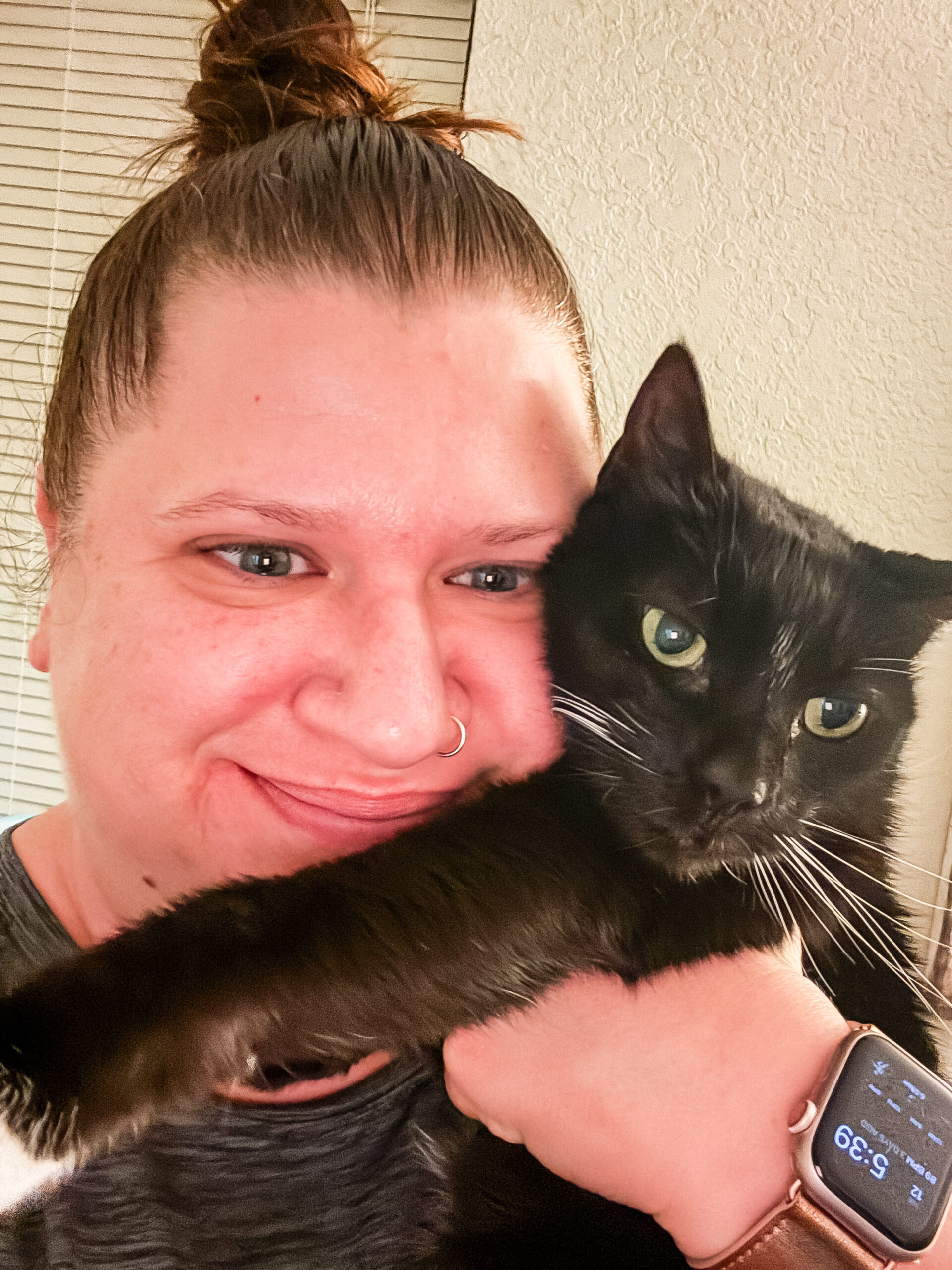 5:39AM: It’s an early morning for me. Eloise is being very chatty, so I pick her up to try to give her some extra snuggles. She acts like I’m trying to strangle her, sigh.