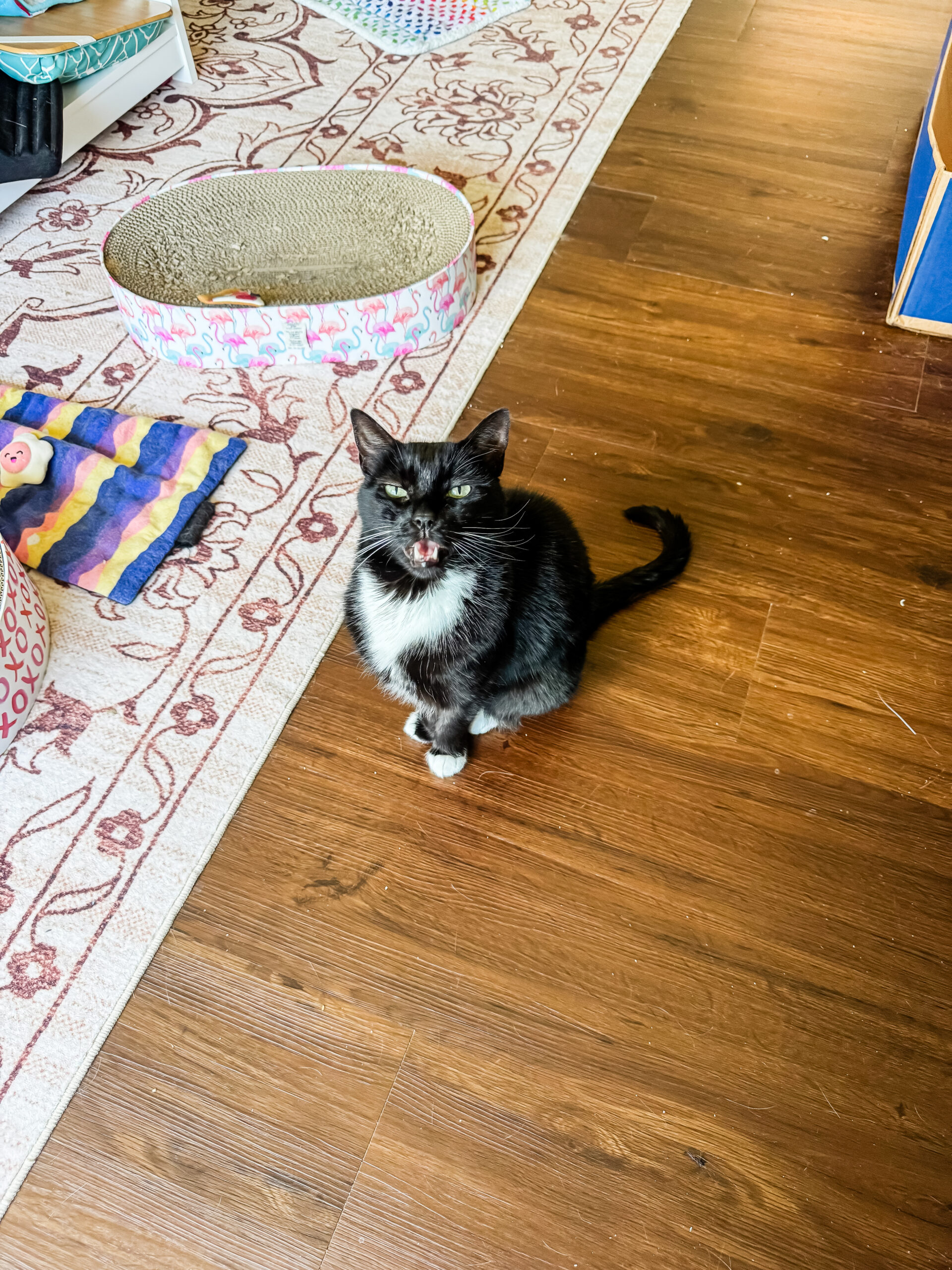5:45PM: I’m done with work and need to complete my chores for the day (laundry, which is done, and vacuuming my living room rug). I have to pick up all of the cat toys and scratchers and loungers from the floor and push my coffee table out of the way. Afterward, I dump out so much cat hair from my vacuum. It was honestly impressive.