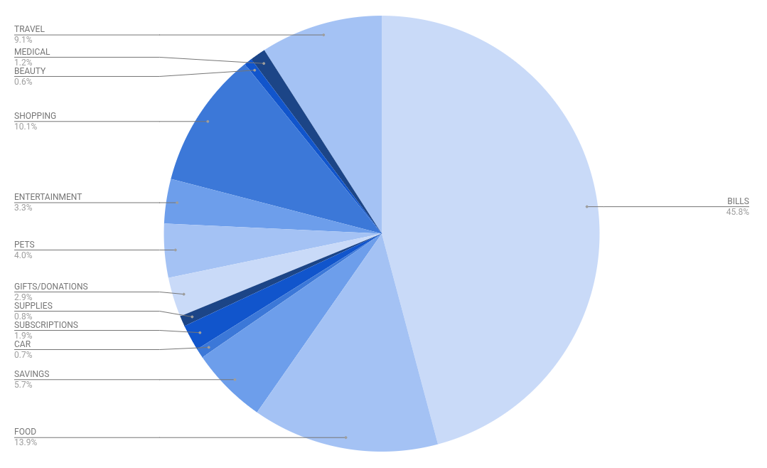 Bills (45.8% | ↑ 29.7% from January): This increase looks scary, but it’s really only because I didn’t have to pay rent in January. This category comprises all of my bills, including rent, utilities, Internet, phone, gym, electric, my school loan, and my car payment.